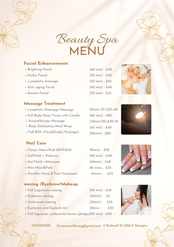 At Vow Your Wellbeing, we believe beauty and relaxation should be stress-free — including the price. Our treatments are carefully priced to reflect quality, comfort, and professional care. Whether you’re here for relaxation or renewal, you’ll always know exactly what to expect.
